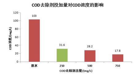 通過(guò)小試數據,在pH值為7.5的情況下,最終選擇濃度為250mg/L的COD去除劑,處理效果最佳,可確保出水COD達標。該去除效果相比之前客戶(hù)使用聚合氯化鋁噸水處理成本降低33%,去除效率更高。
