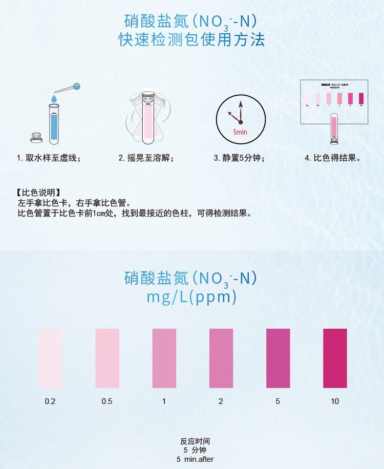 2.本產(chǎn)品檢測水中硝酸鹽氮(NO3- -N)含量在0.2-10mg/L(ppm)范圍內,若要檢測5mg/L以上濃度水樣,請預先稀釋水樣后再進(jìn)行測定,具體操作見(jiàn)稀釋說(shuō)明書(shū)。