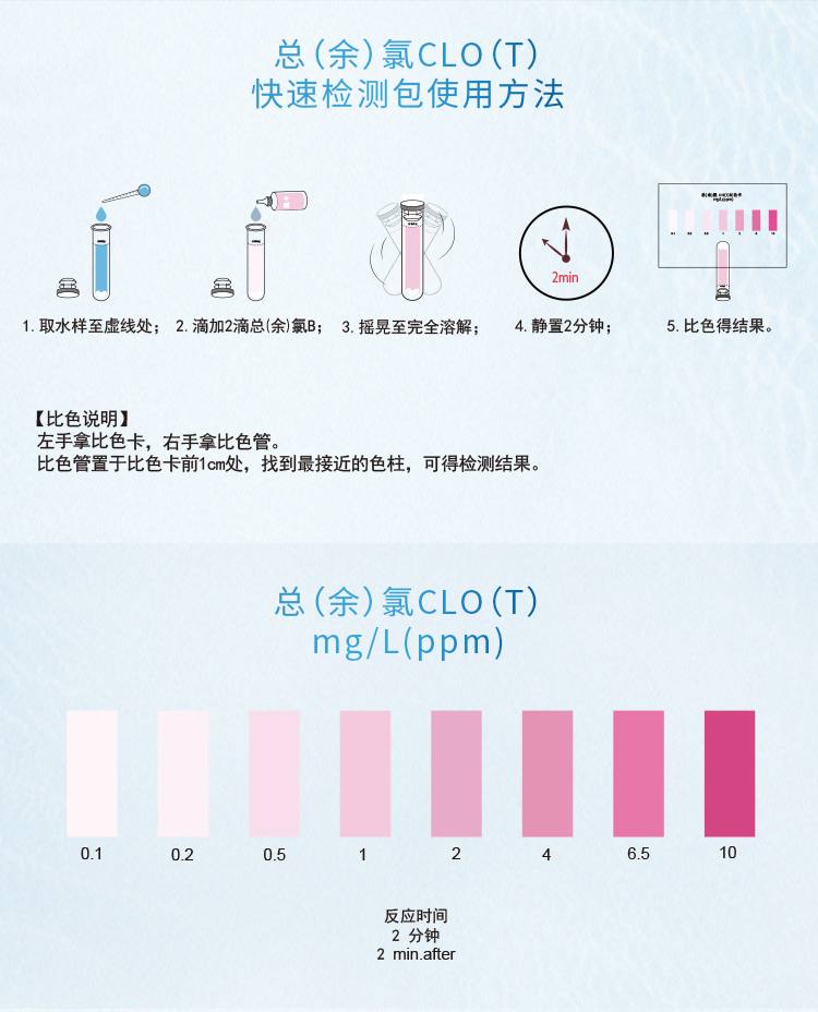 2、本產(chǎn)品檢測水中總(余)氯ClO(T)含量在0~10mg/L(ppm)范圍內,濃度過(guò)高會(huì )產(chǎn)生紅色沉淀而影響比色,若要檢測10mg/L以上濃度水樣,請預先稀釋水樣后再進(jìn)行測定,具體操作見(jiàn)稀釋說(shuō)明書(shū)。。