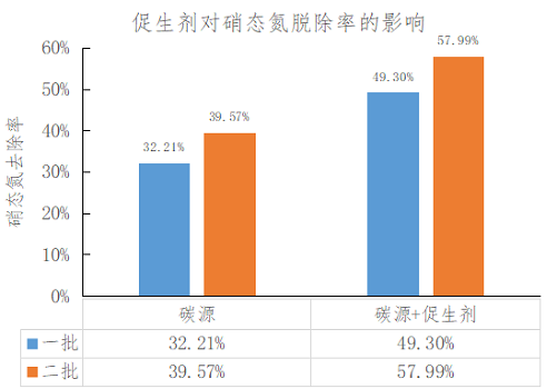 促生劑對反硝化脫氮的促進(jìn)作用:以某廠(chǎng)化工污水生化處理過(guò)程中的脫氮效果為例,添加水體十萬(wàn)分之一的促生劑能夠提升17.09%-18.42%的硝態(tài)氮脫除率。