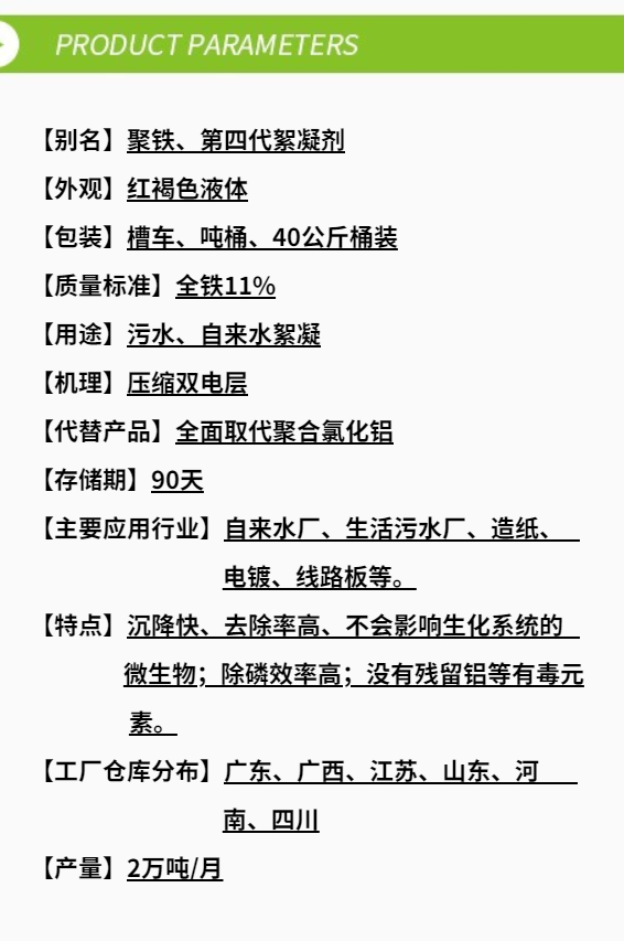 1.高效:聚合硫酸鐵是復合型高分子聚合物,分子結構龐大,吸附能力強,凈水效果優(yōu)于所有傳統的無(wú)機凈水劑;
