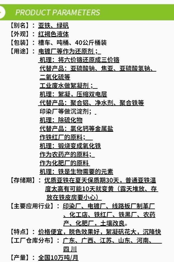 長(cháng)隆科技硫酸亞鐵:別名:亞鐵、七水硫酸亞鐵、綠礬、烘干型硫酸亞鐵,用途可作為電鍍廠(chǎng)等作為還原劑,工業(yè)廢水做絮凝劑,印染廠(chǎng)等做沉淀劑,作鐵紅廠(chǎng)的原料,作為農藥廠(chǎng)的原料,作為化肥廠(chǎng)的原料,硫酸亞鐵花卉中施肥等等。