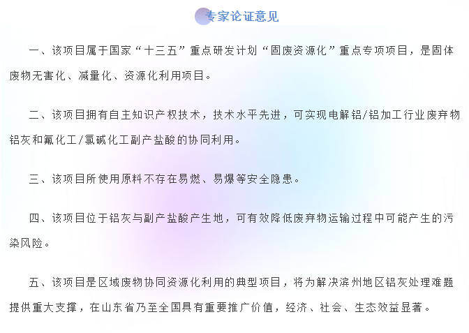與會(huì )專(zhuān)家聽(tīng)取了建設企業(yè)及技術(shù)團隊對技術(shù)總體情況的匯報。在充分質(zhì)詢(xún)、討論后,專(zhuān)家一致認為,本項目技術(shù)路線(xiàn)合理、前期基礎扎實(shí),可實(shí)現電解鋁/鋁加工鋁灰和副產(chǎn)鹽酸的協(xié)同利用,屬典型的資源循環(huán)利用項目。