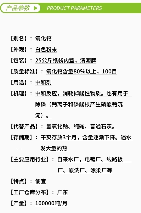 1.調節酸性污水的pH值,污泥調質(zhì),廣泛用于電鍍、制革,化工、線(xiàn)路板、酸洗、印染、造紙等行業(yè)的污水處理;
